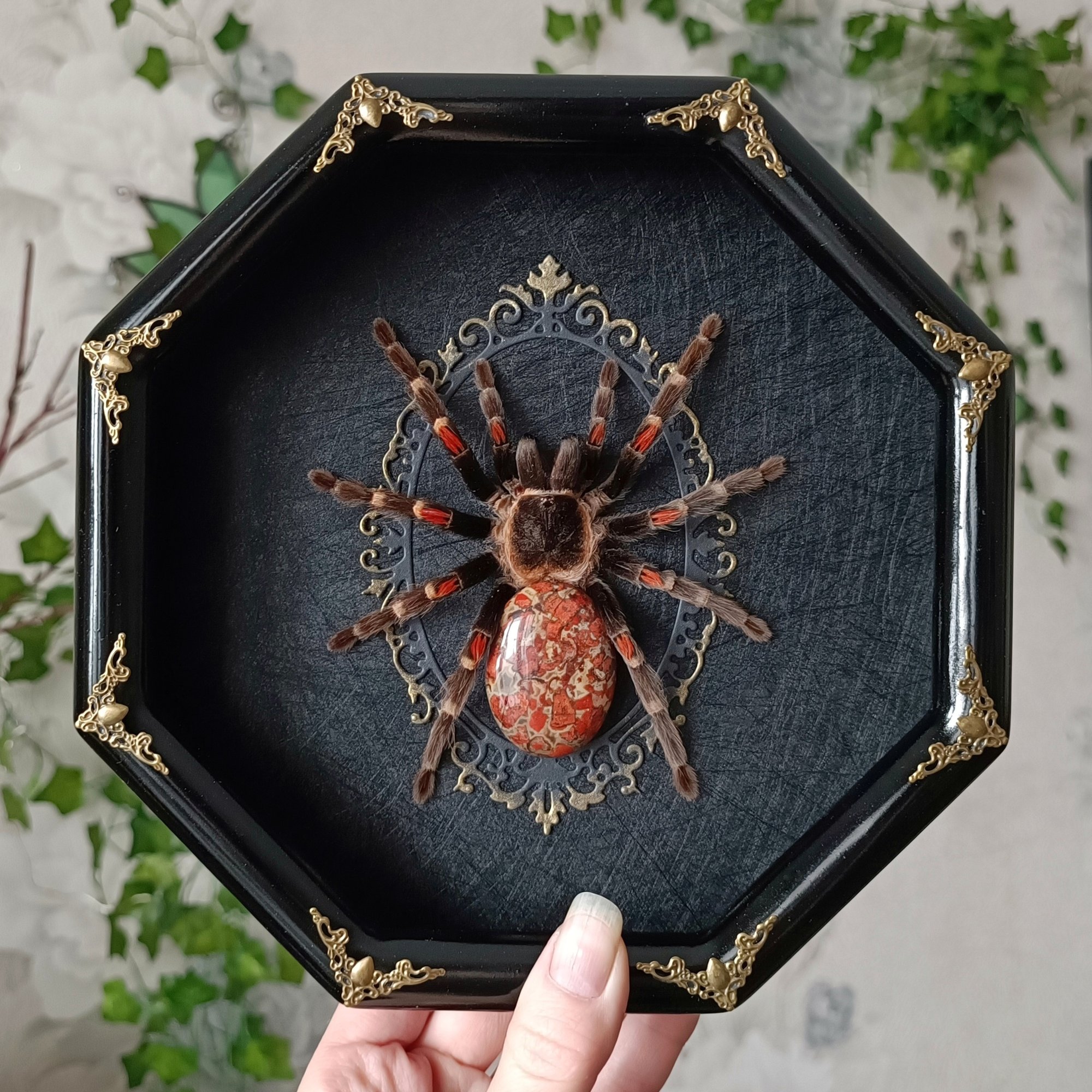 It is 100% handmade work that includes preserved spider, frame, painting. This frame is unique and sold as a single copy.